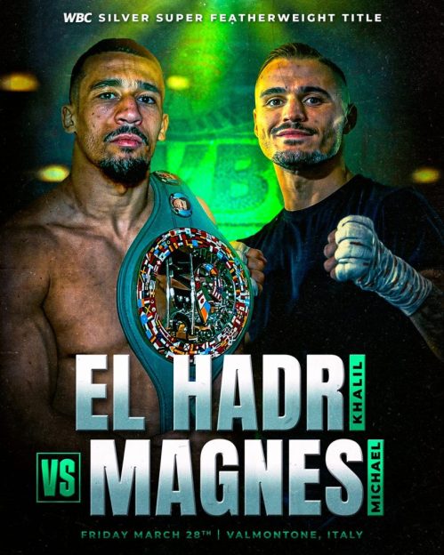 Torna il venerdì pugilistico in Televisione con la sfida di domani tra i superpiuma Khalil El Hadri campione WBC Silver e il nostro Michael Magnesi, decisamente il numero uno italiano senza limiti di peso, seguito a ruota da Guido Vianello (massimi), Ivan Zucco (supermedi) e Giuseppe Squeo (massimi leggeri), tutti pronti alle prossime grandi sfide. Il match si svolgerà all’interno del Parco Divertimenti Magicland di Valmontone e sarà teletrasmesso in diretta dalle 22 su RaiSport. Magnesi in pratica cerca di tornare in possesso di quel titolo che già fu suo e che gli fu tolto in un drammatico match dal giapponese Rikiishi. Magnesi è ben visto nell’ambito WBC e se dovesse vincere contro il francese per lui c’è già nero su bianco per una sfida mondiale WBC con il campione O’Shaquie Foster . El Hadri non sarà un avversario facile, ma “Lupo solitario” ne è consapevole e si presenterà sul ring in piena forma. Il francese è più alto ed ha una boxe sfuggente, cosa non gradita dal pugile di Cave che preferisce lo scambio per far sentire la sua potenza non indifferente. Nella serata vedremo tra i protagonisti Simone Spada, Manuel Rizzieri e Christian Malvitano