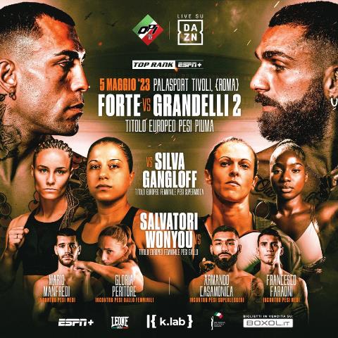 Il main event della serata è l’atteso rematch tra Mauro Forte (17-0-2, 7KO) e Francesco Grandelli (16-1-2, 3KO) valido per il Titolo Europeo dei pesi piuma. Forte e Grandelli si sono già sfidati nel n\ovembre 2021, durante la Dazn Boxing Night di Roma, in dodici riprese spettacolari terminate con un pareggio per Split Draw, verdetto che consentì a Mauro Forte di mantenere la cintura di campione dell’Unione Europea. Adesso in palio c’è la pregiata cintura europea, lasciata vacante dallo spagnolo Kiko Martinez, il cui valore darà uno stimolo e una determinazione in più ai due pugili.