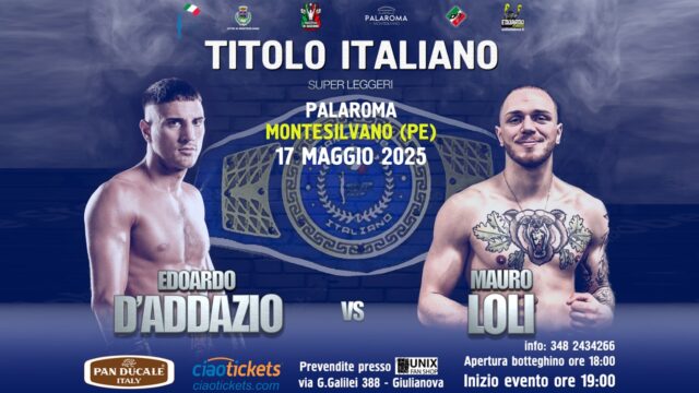 A Montesilvano sul ring del PalaRoma si sono affrontati l’imbattuto Edoardo D’Addazio e Mauro Loli in un match valevole per il Titolo Italiano dei superleggeri, lasciato vacante da Armando Casamonica. D’Addazio ha vinto ai punti con verdetto unanime, ma ha dovuto sudare le proverbiali sette camicie con un avversario sempre pronto alla replica. La serata era organizzata dalla OPI Since 82.