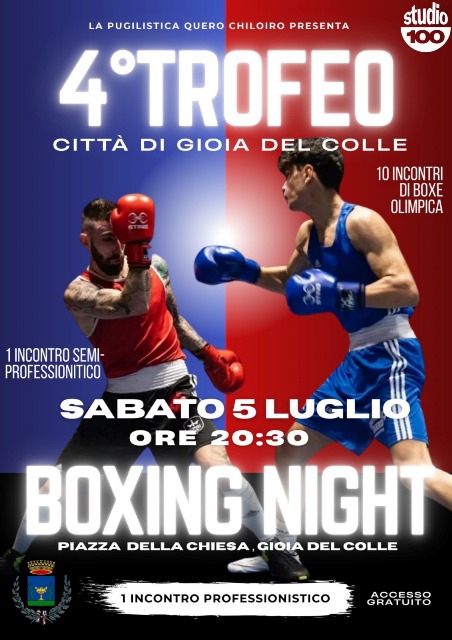 In allestimento invece per sabato prossimo 5 luglio il 4^trofeo Città di Gioia del colle, il gran galà della boxe organizzato dalla Quero-Chiloiro per il quarto anno consecutivo grazie al supporto di Antonio Donvito, che a ogni edizione si sta mostrando sempre più operativo grazie alla passione e dedizione per i figli Alessandro e Davide Donvito, pugili della Quero-Chiloiro. La manifestazione sportiva avverrà in piazza Della Chiesa, con apertura alle ore 20 per dar vita a una completa rappresentazione di tutti i settori della boxe, dal giovanile con lo sparring-io, ai match dilettantistici con l’undercard del match di Alessandro Donvito negli élite 75 kg che con un record di 27 vittorie, 5 pari e 15 sconfitte e il primo posto all’ultima edizione della Coppa Italia 4×3 senza canotta, affronterà l’esperto Nicola De Fato dell’Accademia pugilistica andriese con ben 58 match all’attivo. Infine, match clou dell’evento, l’incontro professionistico del peso medio savese Giovanni Rossetti, alle prese sulle sei riprese con lo spagnolo Roberto Casado Olmedo, pugile quotato madrileno che si presenta come un ostico avversario dopo aver battuto il forte tedesco Zeynel Elbir e con un record di 4 vittorie, 1 pari e 5 sconfitte. Record invece di 14 vittorie e 4 sconfitte, per il campione italiano medi e campione del mondo youth ubo 2022 Giovanni Rossetti, che tornerà sul ring dopo aver disputato l’ebu silver in Francia contro il campione in carica Diego Natchoo.