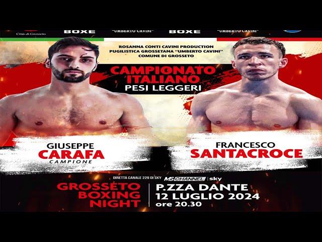 Il Titolo Italiano sta riacquistando il ruolo che gli compete facendoci assistere a spettacoli molto apprezzati da un pubblico sempre più numeroso. Con l’organizzazione del Team di Rosanna Cavini piazza Dante a Grosseto è stato lo scenario della bella sfida tra il campione Giuseppe Carafa e lo sfidante Francesco Santacroce. Alla fine il punteggio ha premiato Carafa con 97-94, 97-93 e 95-95. Non unanime quindi, ma buono per fare capire l’intensità del match. Il pugliese ha tecnica in abbondanza, ma il suo avversario ha utilizzato le armi di una boxe solida ed efficace. Nelle prime riprese la velocità del campione imbriglia l’aggressività dello sfidante. Ma Santacroce non è venuto a fare da comparsa e Carafa cerca di tenersi fuori dalla portata dei ganci dello sfidante che non sono certo carezze. Il VII round racchiude in tre minuti la bellezza di tutto il match dove ognuno da il meglio di se di fronte a un pubblico entusiasta. Gli ultimi round sono condotti ad un ritmo alto con il gong finale del X round che diventa un segnale per applaudire i due pugili.