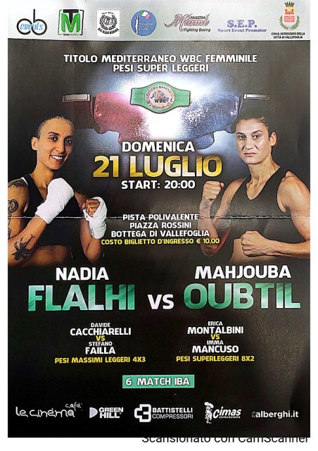 Il clou sarà retto da Nadia Flalhi del team Ruffini che contenderà alla marocchina Mahjouba Oubtil il vacante titolo WBC del Mediterraneo dei pesi superleggeri.