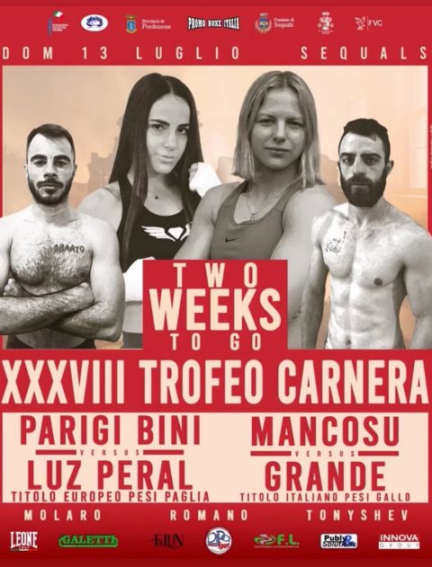 Si è svolto a Sequals in occasione del 28° Trofeo dedicato a Primo Carnera un’ interessante riunione organizzata ancora una volta dalla Promo Boxe Italia. In palio c’erano due titoli. L’attesa sfida tra le donne vedeva di fronte Vittoria Parigi Bini opposta alla spagnola Maria Luz Peral valevole per il vacante Europeo dei Paglia. Alla fine di 10 round condotti a buon ritmo veniva sancito un risultato di parità, che lasciava il vuoto nella casella EBU. La pugile spagnola cercava di prendere l’iniziativa attaccando senza respiro l’italiana. La Parigi Bini, però non si lasciava intimorire e smorzava o controbilanciava la situazione con una boxe tecnicamente pregevole e la maggiore precisione dei suoi colpi. Alla fine la parità rimandava ai posteri la sentenza europea. Nell’altro match brillante prestazione del sardo Nicola Mancosu che conquistava il titolo italiano di gallo lasciato vacante da Salvatore Contino, contro di lui l’esperto Claudio Grande nulla ha potuto. La precisione dei colpi e la maggior mobilità sulle gambe non lasciavano dubbi sul vincitore, per Mancosu era il 14° successo consecutivo, dopo aver iniziato la carriera Pro con 5 sconfitte.