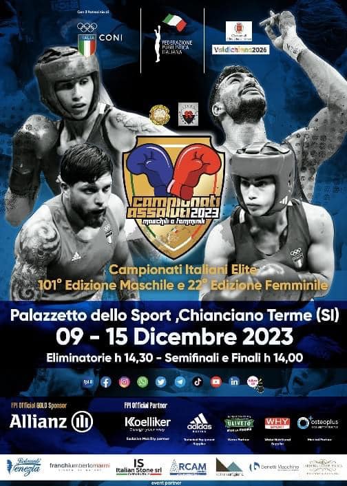 MER 13 DIC 2023 – Edizione 2023 dei Campionati Italiani Assoluti M/F, indetta dalla FPI e organizzata dalla ASD Carrarese E. Bertola/Boxing Club Siena in collaborazione con il CR Toscana si svolge al PalaSport di Chianciano Terme (SI).